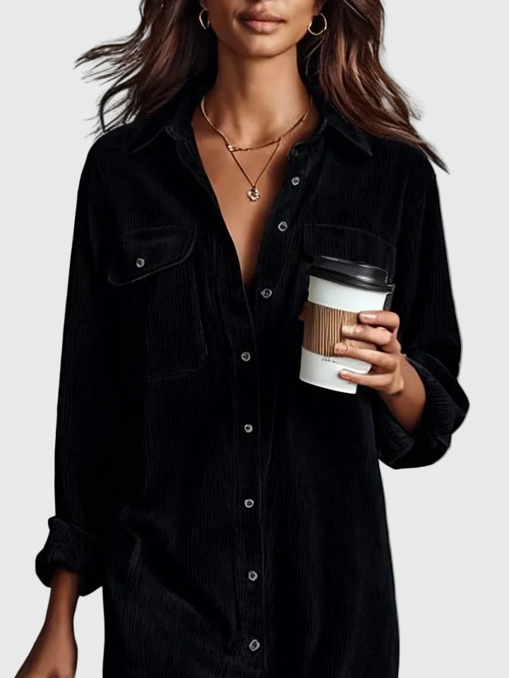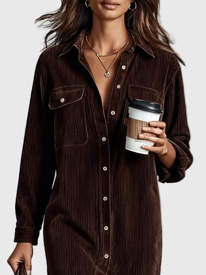 A comfortable and elegant midi dress made from soft corduroy, featuring a loose silhouette, double chest pockets, and a classic single-button front closure. Perfect for everyday wear with a touch of retro charm.